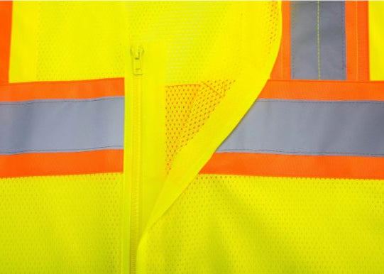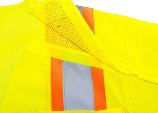 This high-visibility safety vest features a full polyester mesh construction, 2-inch silver reflective tape with contrasting trim, and five breakaway points at the sides, shoulders, and front.